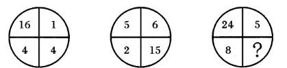 解析 16 / 4 = 4 / 1,5 / 2 = 15 / 6,24 / 8=? /5,故问号处应为15。