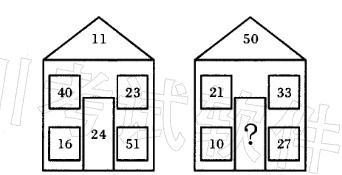 解析 窗户和屋顶上的数字个位数和十位数相加后等于门上的数字,1 + 1 + 4 + 0 + 2 + 3 + 1 + 6 + 5 + 1 = 24→? =5 + 0 + 2 + 1 + 3 + 3 + 1+0 + 2 + 7 = 24,故本题正确答案为 A。