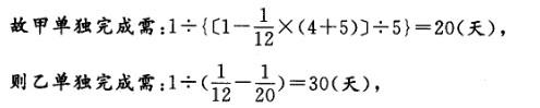 解析 此题中“余下的工程由甲先做10天后,再由乙独做5天”,即可按上述转化成: (1)余下的工程由甲、乙合做5天,甲单独做5天; (2)余下的工程假设由甲、乙合做9天,则超出的工作量应是甲(10 — 5)天完成的。 即甲独做要20天完成,乙要30天。