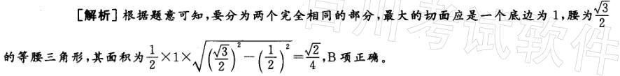 问题 用一个平面将一个边长为1的正四面体切分为两个完全相同的部分,则切面的最大面积为( )。