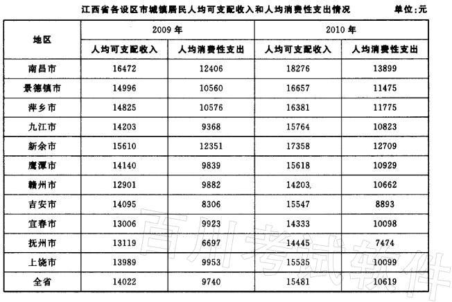 解析 本题考查比重的计算,2010年抚州市的人均可支配收入和消费性支出分别为14445和7474,所以比重为7474/14445≈51.7%,因此答案选择B选项。