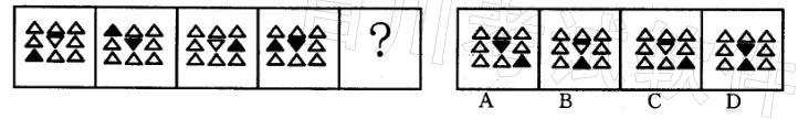 解析 第一个图中左下角的黑色三角形按照顺时针的方向沿着边线依次移动2、3、4格,接下来应移动5格;中心的三角形分别为白色、黑色、白色、黑色,间隔出现,接下来应为白色,故C项正确。