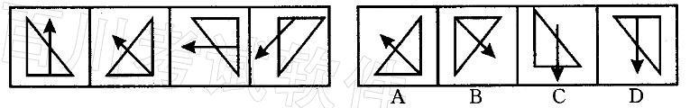 解析 本题的规律为翻转和旋转。在题干图中,三角形依次向右、向下、向左翻转,再向上翻转得到C选项的三角形;箭头逆时针依次旋转45°,与C选项中的箭头方向和位里相吻合。故正确答案为C。
