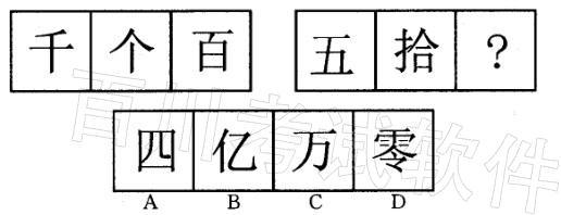 解析 每组图形,前两个图的笔画数之和为第三个图的笔画数。千(3)+个(3) =百(6),五(4)+拾(9)=零(13),故选 D。
