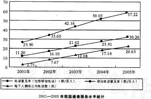 2002-2005年我国电话普及率增长最多的一年是( )。A. 2002 年 B. 2003 年C. 2004 年 D. 2005 年