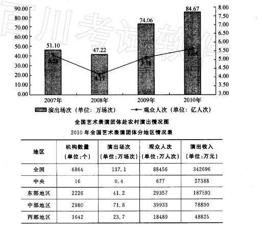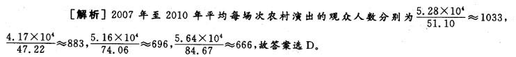 平均每场次农村演出的观众人数最少的年份是( )年。A. 2007 B. 2008 C. 2009 D. 2010