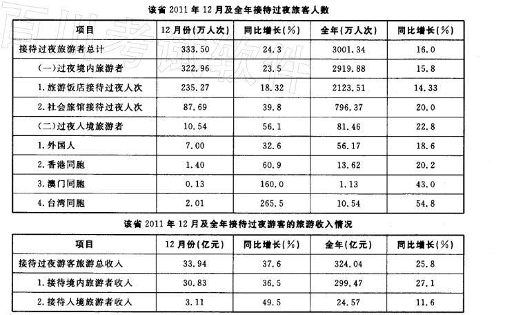 解析 本题属于综合分析題。A选项错误,因为2011年该省旅游饭店接待过夜游客人次只统计了境内的人数。B选项错误,2010年12月该省过夜入境游客中台湾同胞人数为2. 01/(1 + 265.5%)≈0.55(万人次),香港同胞人数为1. 40/(1 + 60. 9%)≈0. 87(万人次)。C选项正确,2011年12月台湾同胞到该省过夜旅游人数明屋超过全年的1/12。D选项错误,因为只统计了过夜旅客的人数,故不知堍外游客消费的增长速度。因此答案选择C选项。