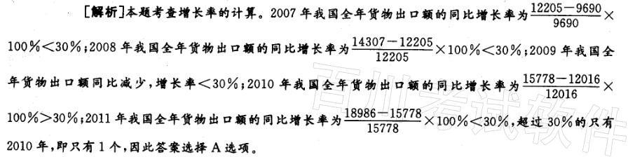 问题 2011年我国全年货物进出口总额36421亿美元,比上年增长22. 5%。其中,出口18986亿美元,增 长20. 3%;进口17435亿美元,增长24. 9%。进出口差额(出口值与进口值差额的绝对值)1551亿美元,比上年减少265亿美元。 2007-2011年我国全年货物出口额与上一年相比增长超过30%的年份有几个?() A. 1个 B. 2个 C. 3个 D. 4个