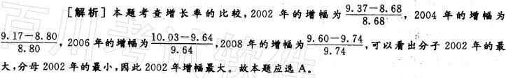 问题 2009年全国海洋生产总值31964亿元,比上年增长8. 6%。全国海洋生产总值占国内生产总值的9.53%,占沿海地区生产总值的15. 5%。海洋第一产业增加值1879亿元,海洋第二产业增加值15062亿元,海洋第三产业增加值15023亿元。 下列哪一年全国海洋生产总值占国内生产总值的比重同比增幅最大?( ) A. 2002 年 B. 2004 年 C. 2006 年 D. 2008 年
