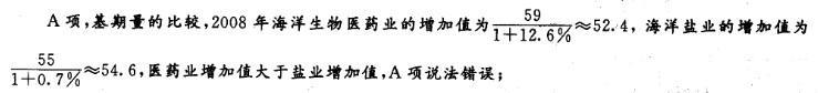 问题 2009年全国海洋生产总值31964亿元,比上年增长8. 6%。全国海洋生产总值占国内生产总值的9.53%,占沿海地区生产总值的15. 5%。海洋第一产业增加值1879亿元,海洋第二产业增加值15062亿元,海洋第三产业增加值15023亿元。 下列说法正确的是( )。 A. 2008年海洋生物医药业增加值高于海洋盐业 B. 2009年增加值排名第三的海洋产业其同比增速也排名第三 C. 2008年全国海洋生产总值占国内生产总值的比重高于2005年 D. 2009年主要海洋产业中只有海洋交通运输业是增加值同比下降的