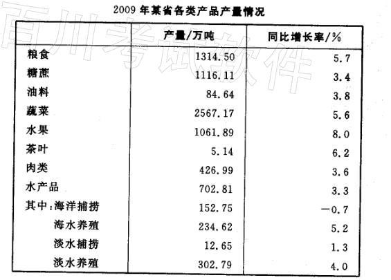 问题 2009年,某省全年粮食作物播种面积253. 85万公顷,比上年增长1. 5%;糖蔗种植面积13. 58万公顷,下降0. 2%;油料种植面积33.14万公顷,增长2. 3%;蔬菜种植面积113. 84万公顷,增长2. 3%。 2009年,海水养殖业产量占水产品养舍业的比重为( )。 A. 77.5% B. 33.4% C. 60.8% D.43.1%