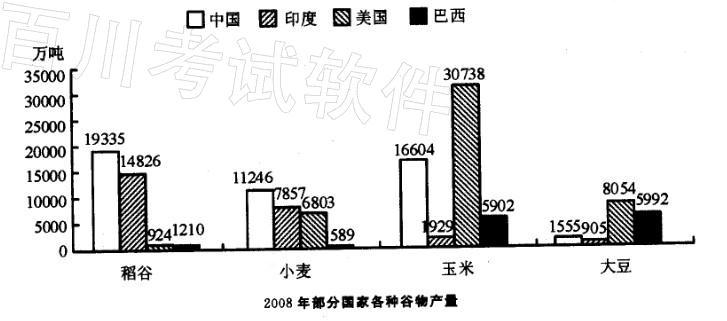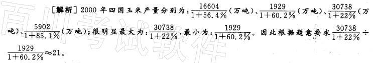 问题 2008年世界稻谷总产量68501.3万吨,比2000年增长14. 3%;小麦总产量68994.6万吨,比2000 年增长17. 8%;玉米总产量82271. 0万吨,比2000年增长39.1%;大豆总产量23095. 3万吨,比2000年增长43.2%。 2000年,表中所列四国玉米的最髙产量约是最低产童的多少倍?( ) A. 11 B. 16 C. 21 D. 26