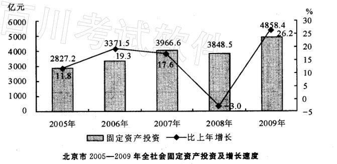 2009年北京市完成全社会固定资产投资4858. 4亿元,比上年增长26. 2%。其中,基础设施投资1462亿元,增长26%,主要投向交通运输和公共服务业...