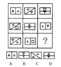 解析 考查图形遍历规律。在每行图形中,分割矩形的三条线段分别为垂直、水平与对角线,内部含有的元素均为正三角、倒三角、正T、倒T、圆和正方形,故第三行图形缺少水平分割线以及正三角与正T,因此D项正确。