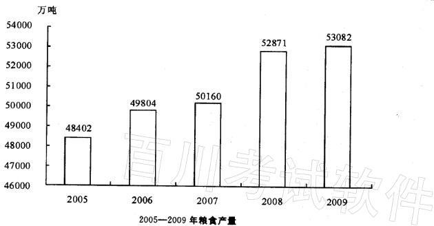问题 2009年全年粮食种植面积10897万公顷,比上年增加217万公顷;棉花种植面积495万公顷,减少80万公顷;油料种植面积1360万公顷,增加76万公顷;糖料种植面积188万公顷,减少11万公顷。 全年粮食产量53082万吨。其中,夏粮产量12335万吨,增产2. 2%;早稻产量3327万吨,增产5. 3%;秋粮产量37420万吨,减产0.6%。 全年棉花产量640万吨,比上年减产14.6%。油料产量3100万吨,增产5.0%。糖料产量12200万吨,减产9.1%。烤烟产量280万吨,增产6.7%。茶叶产量135万吨,增产7.1%。 下列说法中,与资料相符的是( )。 A. 2005-2009年年均粮食增产量不到1000万吨 B. 2008年粮食产量增长率超过6% C.粮食产量增长最快的是2006年 D. 2008年早稻产量约为3160万吨