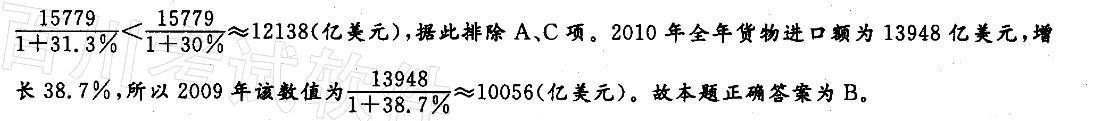 解析 2010年全年货物出口额为15779亿美元,增长31. 3%,所以2009年该数值为