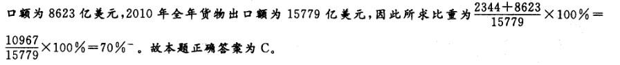 问题 2010年,我国全年货物进出口总额29728亿美元,比上年增长34.7%。其中,货物出口15779亿美元,增长31. 3%;货物进口13948亿美元,增长38.7%。进出口差额1831亿美元,比上年减少126亿美元。 2010年国有企业、外商投资企业的货物出口额占全年货物出口额的()。 A. 60% B. 75.2% C. 69.6% D. 76.8%