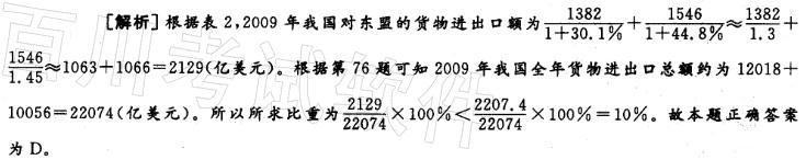 问题 2010年,我国全年货物进出口总额29728亿美元,比上年增长34.7%。其中,货物出口15779亿美元,增长31. 3%;货物进口13948亿美元,增长38.7%。进出口差额1831亿美元,比上年减少126亿美元。 2009年我国对东盟的货物进出口额占我国全年货物进出口额的( )。 A. 11.4% B. 10.9% C. 12.8% D. 9.6%