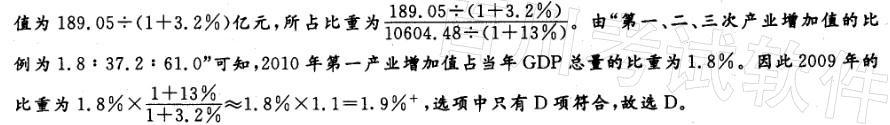 解析 2009年广州地区GDP生产总值为10604. 48/(1 + 13%)亿元,其中第一产业增加