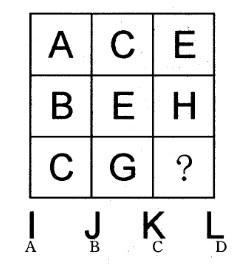 解析 本题的解题规律是字母的间隔数。在第一行中,A和C、C和E之间都隔了一个字母;在第二行中,B和E、E和H之间都隔了两个字母;依次规律,第三行中,字母间都隔三个字母,即问号处为字母K,故正确答案为C。