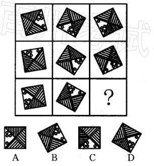 解析 题干中的八个图形都是同一个图形旋转一定角度得到的,选项中只有B项可以旋转得到。