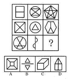 解析 第一行的三个图形都可以一笔画成;第二行的三个图形都可以无重复的两笔画成;第三行的前两个图形都可以无重复的三笔画成,故问号处的图形也应可以无重复的三笔画成。对照选项,A项需4笔,B项需3笔,C项需2笔,D项需2笔。故本题选B。