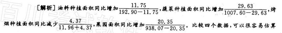 解析 出油料、蔬菜、果园种植面积同比变化都小于10%,而烤烟种植面积同比变化大于20%,故变化最快的是烤烟。本題正确答案为C。