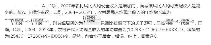 选项 A.2004--2013年,农村居民人均现金收入与城镇居民人均可支配收入同步增长 B.2004--2013年,农村居民人均现金收入与城镇居民人均可支配收入每年都稳步增长 C.2004--2013年,农村居民人均现金收入的年均增长率大于城镇居民人均可支配收入的年均增长率 D.2004--2013年,农村居民人均现金收入的年均增量大于城镇居民人均可支配收入的年均增量