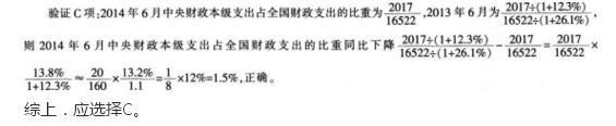 解析 A项,由文字第二段可知,2013年1—6月,全国财政支出为69154-9440<60000,错误; C项,计算精确结果比较复杂,跳过; D项.2014年1—6月地方财政月平均支出额为583426=9XXX亿元<14505亿元,故2014年6月地方财政支出额大于1—5月平均支出额,D错误。直接选择C。