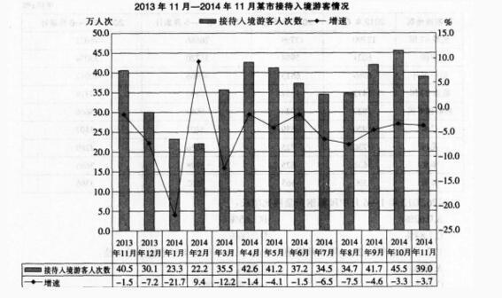 2014年1—11月,某市累计接待入境游客397.4万人次,比上年同期下降5.4%。其中,接待外国游客340.4万人次,下降6.1%;接待港澳台游客56....