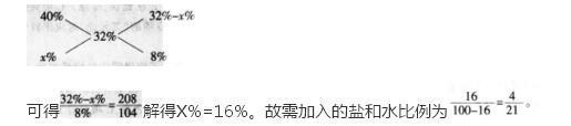 解析 需加入的盐和水的浓度为X%,加入的盐和水的质量为312﹣208=104千克二运用十字交叉法: