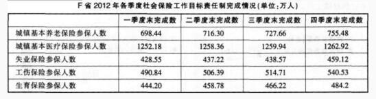 2012年,F省社会保险工作年度目标任务如下:城镇基本养老保险目标任务为725.O0万人,城镇基本医疗保险目标任务为1260.00万人,失业保险目标任务为...