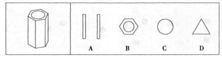 下列的立体图形是六棱柱中挖出一个圆柱后形成的,如果从任一面剖开,以下哪一个不可能是该立体图形的截面? A.如图 B.如上图 C.如上图...