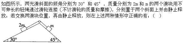 选项 A.质量为2m的滑块受到重力、绳的张力、沿斜面的下滑力和斜面的支持力的作用 B.质量为m的滑块均沿斜面向下运动 C.绳对质量为m滑块的拉力均大于该滑块对绳的拉力 D.系统在运动中机械能均守恒