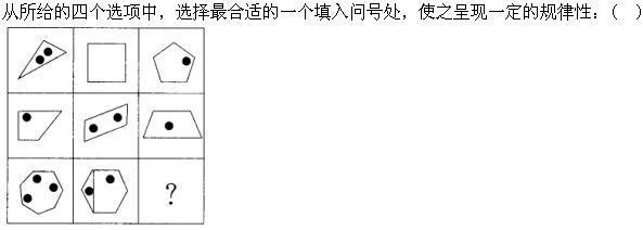 解析 每列前两个图形中的黑点数相加等于第三个图形中的黑点数,因此问号处的图形应含2个黑点,排除A项;每列前两个图形中角的个数相加等于第三个图形中角的个数,故答案选D。