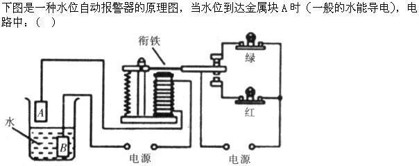 解析 当水位没有达到A时,电磁铁没有磁性,只有绿灯亮;当水位到达A时电路接通,电磁继电器有磁性,衔铁会在电磁力吸引的作用下与红灯接通,红灯亮;该警报器的红、绿灯不会同时亮。故答案选B。
