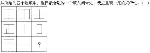 解析 题干每个图形中的水平线与竖直线的数量都相差1,选项中只有B符合。或者每个图形中的线条数都是奇数,选B。