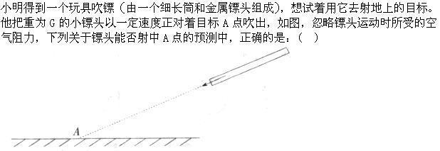解析 小镖头以一定速度正对着目标A点吹出后,镖头由于惯性继续朝A运动,此过程中,忽略镖头运动时所受的空气阻力,镖头只受到重力这一个力的作用(非平衡力),所以镖头还会沿重力方向向下运动,故镖头做斜向下的曲线运动,由此可知镖头会落在』4的右侧。故选项C正确。