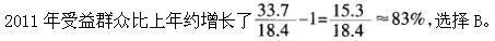 2011年T市完善价格补助联动机制使受益群众比上年约增加了:( ) A.78% B.83% C.85% D.89%