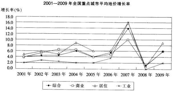 相关内容:2001年,2007年,工业,地价,增长率,B.36.5%,C.57.4%