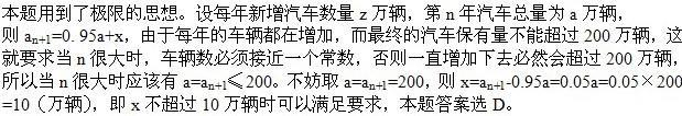 问题 某市2009年末汽车保有量为50万辆,预计此后每年报废上一年末汽车保有量的5%,并且每年新增汽车数量相等。如要求该市汽车保有量不超过200万辆,那么每年新增汽车数量不应超过多少万辆?( )