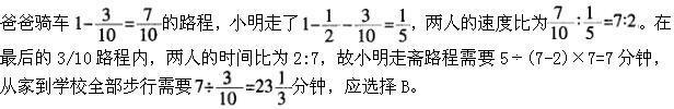 问题 小明早上从家步行去学校,走完一半路程时,爸爸发现小明的数学书丢在家里,随即骑车去给小明送书,追上时,小明还有3/10的路程未走完,小明随即上了爸爸的车,由爸爸送往学校,这样小明比独自步行提早5分钟到校。小明从家到学校全部步行需要多少时间?( )