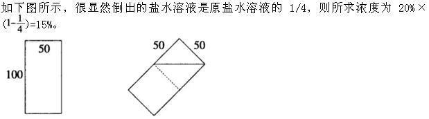 问题 已知一内直径为50cm,内高100cm的圆柱形木桶,灌满了浓度为20%的盐水溶液,使其倾斜45度倒出部分溶液后放平,再加满清水。问此时木桶内盐水溶液的浓度是多少?( )