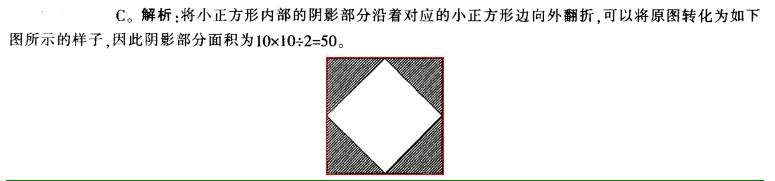 问题 在下图中,大正方形的边长为10,连接大正方形的各边中点得到小正方形,将小正方 形每边三等分,再将三等分点与正方形的中心和对应的顶点相连,得到如下图形。那么阴影部分面积是()。