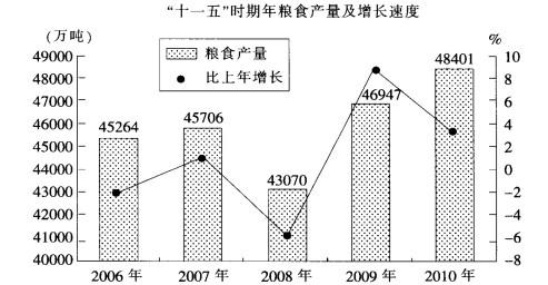 问题 根据上图,下列说法正确的是()。 A. “十一五”期间粮食产量逐年上升 B. “十一五”期间粮食产量增长率逐年提高 C.“十一五”期间粮食产量最高的年份是2009年 D.“十一五”期间粮食产量增长率最高的年份是2009年