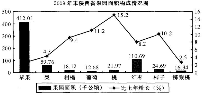 2009年果园面积增长最快的前三种果品的增长率的和比这三种果品产量增长率的和约()个百分点。A.多 62. 1 B.少 24. 1 C.少 6...