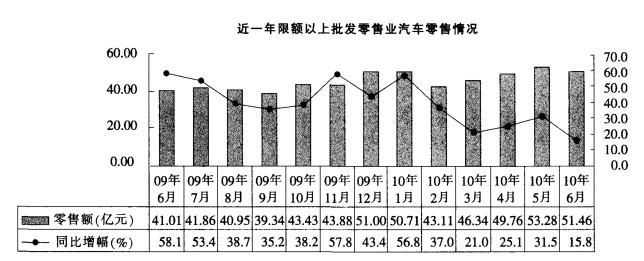 问题 某省汽车及石油类零售额保持较快增长。随着2009年以来汽车购置税减免政策的实施, 汽车消费快速增长,在2009年增长42%的基础上,2010年依然保持了较快增长速度。限额以上批发零售企业2010年1-6月实现汽车类零售额294.7亿元,同比增长29.9%,比社会消费品 零售总额增速高11.4个百分点。同时汽车消费的快速增长带动了石油等消费品的快速增长, 2010年1-6月石油及制品类零售额222.3亿元,增长43.4%,汽车及石油类零售额的增长拉 动限额以上批发和零售业零售额增长19.8个百分点,拉动社会消费品零售总额增长5.1个百分点。 下列说法中,正确的一项是()。 A.2010年2-6月,该省汽车零售额逐月上升 B.2009年上半年该省汽车零售额高于下半年 C.2010年上半年该省社会消费品零售总额同比增长18.5% D.2010年上半年该省汽车销售额超过300亿元