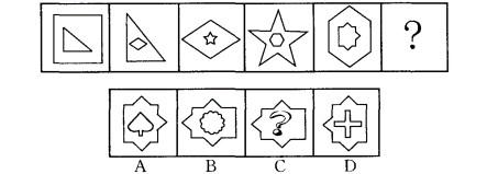 解析 题干图形均由内外两个小图形组成,从第二幅图开始,每一幅图形的外部 图形都是由前一幅图形内部的小图形旋转或者翻转而成。故排除B、C两项。题干内部图形 均由直线构成,且小于180°的内角数分别为3,4,5,6,7,(8),故排除A项,选D。