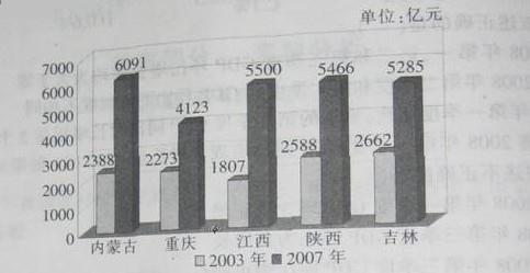 下图显示的是内蒙古、重庆、江西、陕西、吉林五个省(市)2003年与2007年地区生产总值,请根据图形回答问题。 与2003年相比,陕西省200...