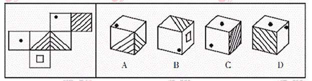 解析 显然可见A展开后,三面位置关系与平面图形中一致,A可由题图折叠而成;B中左右侧面应是相对面,故不能由题图折叠而成;C中,若假定右侧面是正确的,则显然可见左侧面中黑点位置与题图不符;D中,左右侧面的位置关系与题图不符。